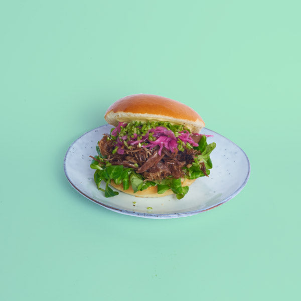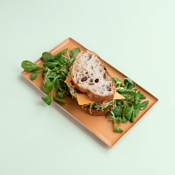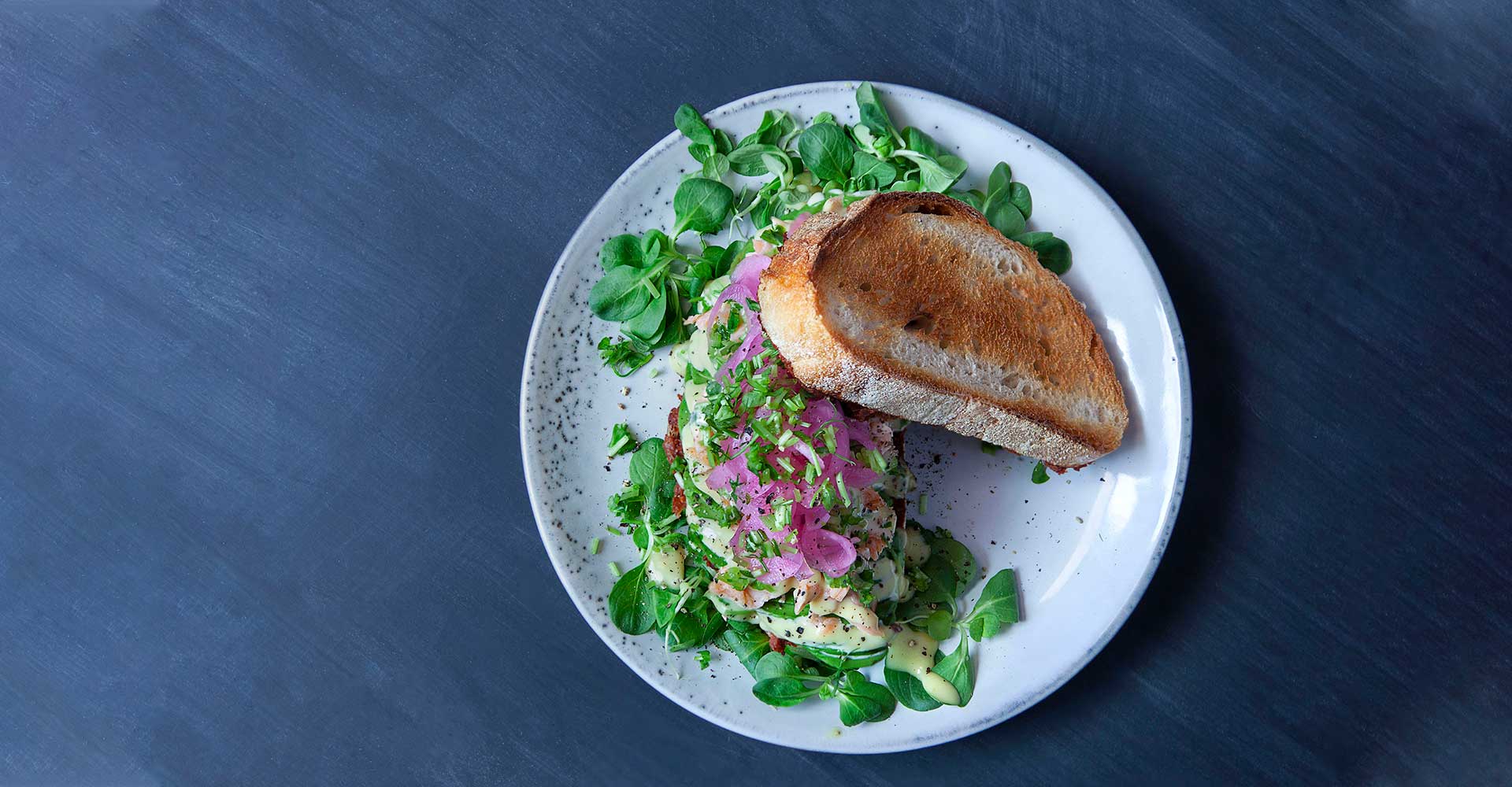 - Banditten: Varmrøget laks eller confiteret and. Ristet surdejsbrød med soltørret tomat tapenade, halv avocado, honeymustard mayo, syltede rødløg & ærteskud.